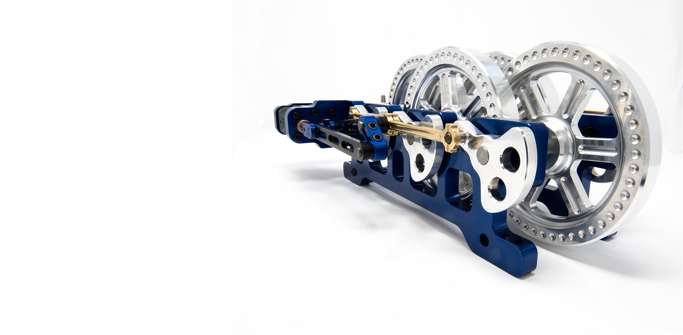 Our Locomotor is a representation of how steam locomotives functioned in a bygone era. Made from 6061 billet aluminum and powered by your air supply, the Locomotor highlights the steam drive mechanism that moved people and products from one end of Canada to the other. The function of the drive mechanism is fun to watch and the chug, chug of the air pistons as they move back and forth in their housing will bring back memories of a simpler time.